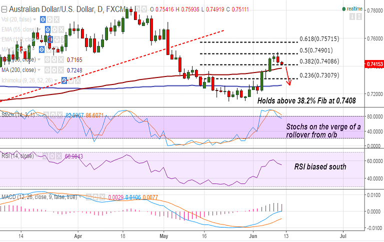 - The pair is now holding above 38.2% Fib (0.78351 to 0.71450 fall) support, break below finds next support at 0.7383 (100-DMA), 0.7308 (23.6% Fib) and then 0.7261 (200-DMA).