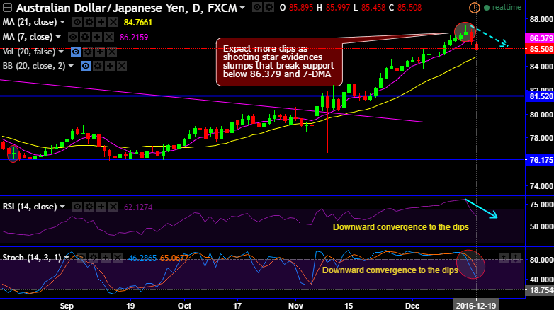 Expect more dips as shooting star evidences slumps that break support below 86.379 and 7-DMA.