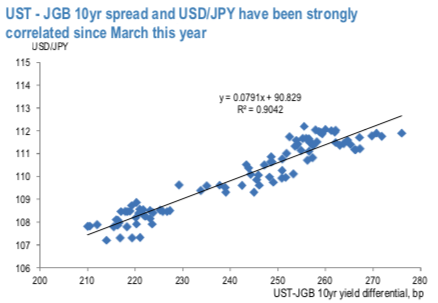 USDJPY moves about 0.8yen when UST-JGB 10yr yield spread move 10bp. Since the yield spread moved only between 210bp and 227bp, USDJPY fluctuated within a narrow range. The U.S. and Japan rates research team believe the yield spread is unlikely to change at least in Q3, which suggest USDJPY may stay this narrow range in coming months.