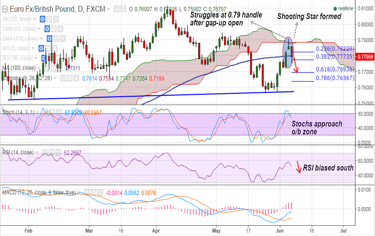- 0.7906 is stiff resistance which is 61.8% Fib retrace of 0.8117 (Apr 7th high) to 0.7565 (May 25th low).