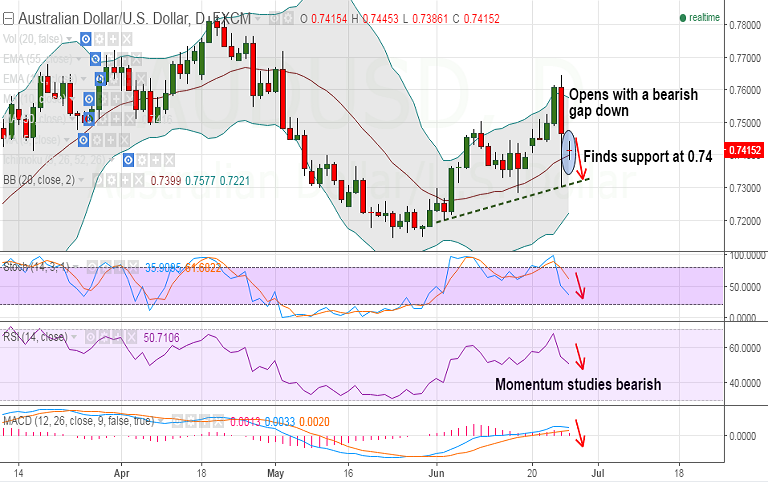 - The pair finds minor support at 0.74 (20-DMA), break below will drag the pair lower to test trendline at 0.7315.