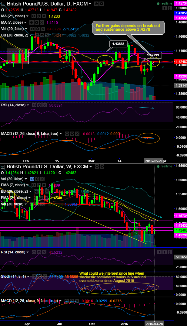 You make money not always when you buy or sell or hold but when you remain sidelines, it is not necessarily need to trade everyday or every time, trade discipline is what makes you the successful trader. So, short term traders need to wait and watch out for breach of above stated pivot levels (1.4280 or 1.4229) on a closing basis.
