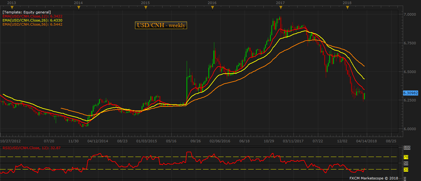 A temporary short-term rebound looks increasingly likely in USD/CNH exchange rate, which has declined steadily from 6.99 in January 2017 to 6.31 as of today. It is already in a bounce back after reaching as low as 6.24 in March this year, which was the lowest level for the pair since April 2015.