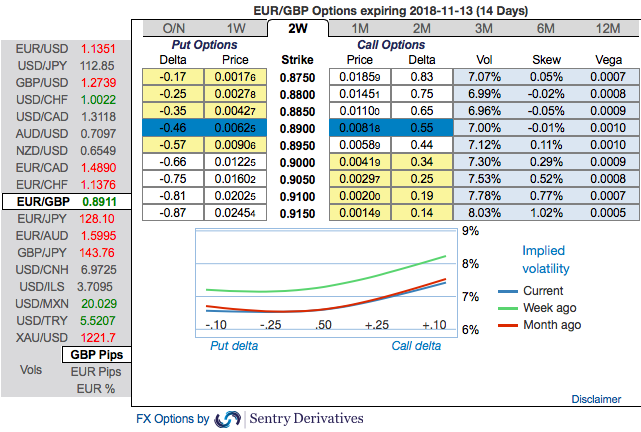Please be noted that EURGBP implied volatilities of short-term tenors are shrinking away, while long-term tenors are rising. Positively skewed IVs of 2w have been well-balanced on either side, while the same has been indicating more bullish risks by bidding OTM call strikes.