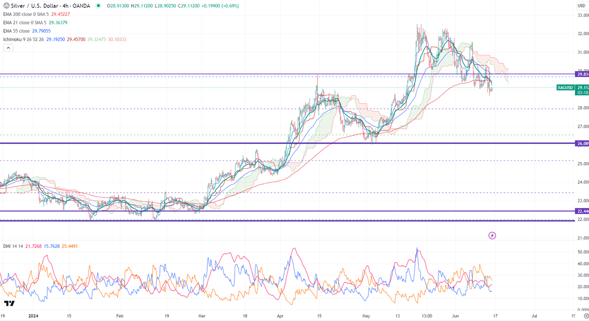 It trades below 21 and above 55- EMA, and 200 EMA in the 4-hour chart. The near-term support is around $28.60 and a break below the target of $28.30/$27.90/$27. On the higher side, immediate resistance is around $29.50 and any breach above targets is $30/$30.70/$31.50/$32/$32.50.
