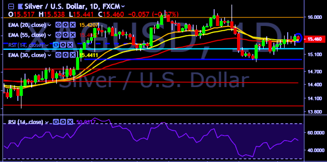 We prefer to take short position on XAG/USD around $15.47, stop loss at $15.55 and target of $15.22.
