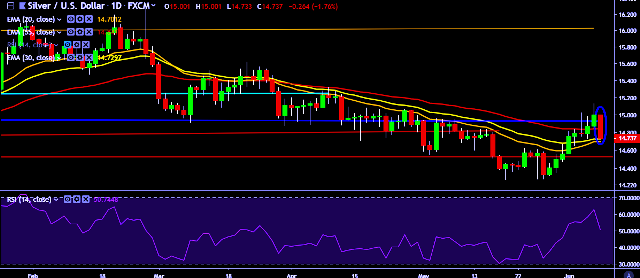 We prefer to take long position on XAG/USD around $14.78, stop loss at $15.02 and target of $14.40.