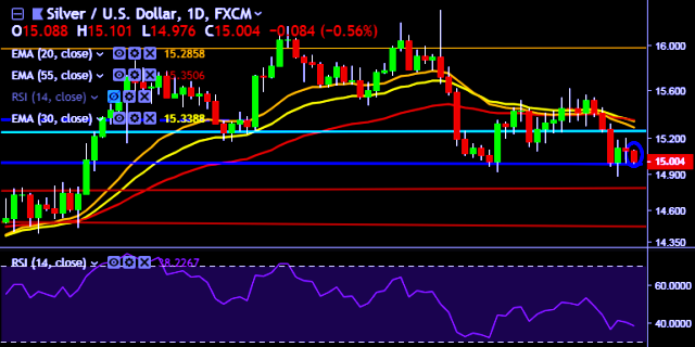 We prefer to take short position on XAG/USD only below $14.99, stop loss at $15.10 and target of $14.87/$14.68.