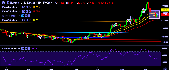 We prefer to take short position on XAG/USD only below $17.72, stop loss at $17.98 and target of $17.42.