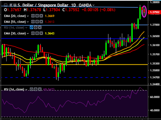 We prefer to take long position on USD/SGD around 1.3740, stop loss at 1.3720 and target of 1.3780/1.3854.