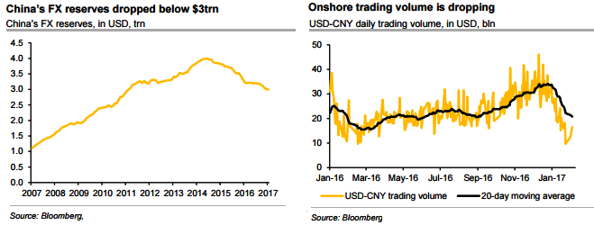 The China’s FX reserves dipped below the USD3trn watermark in the first month of 2017. Indeed, China has burnt down USD1trn FX reserves to conduct direct FX market intervention since mid-2014. However, this has not changed the market expectations over CNY exchange rates.