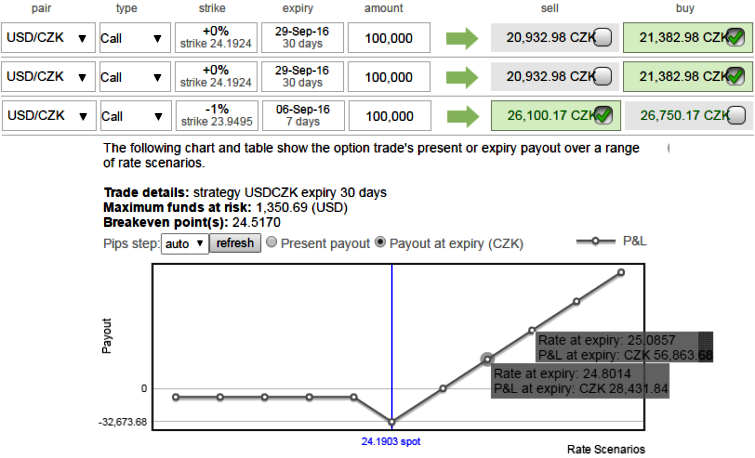 So, trading option spreads in different strikes allows the traders in many tricky market scenarios and likely to fetch positive cashflows. One can observe the rising positive cashflows as the underlying USDCZK spot FX keeps spiking on the higher side.