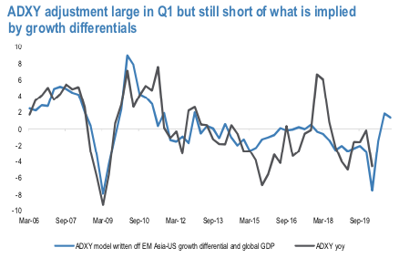 While the adjustment in EM Asia FX in Q1 has been meaningful, it still fell short of growth differential-based model predictions (refer 1st chart). ADXY’s 4.5% y/y drop is 3% less than the move implied by EM Asia-US growth gap and the global growth pulse – i.e. a sharp sell-off by itself has not injected unjustified risk premium into Asian FX.