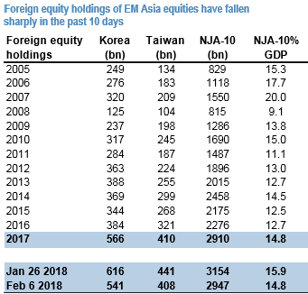 Over the past month, our EM Asia local market strategy has sought to prepare for such a correction by scaling back on OW in MYR FX and OW in INDOGBs, and raising UW on Thai government bonds in the GBI-EM Model Asia Portfolio. The above figure shows that the foreign holdings of NJA equities as a proportion of GDP. They had surged from an estimated 14.85% on 29th December 2017 to 15.93% on 26th January 2018, but at the time of writing are below the end-2017 level, with the largest pullback in Korean holdings followed by Taiwan.