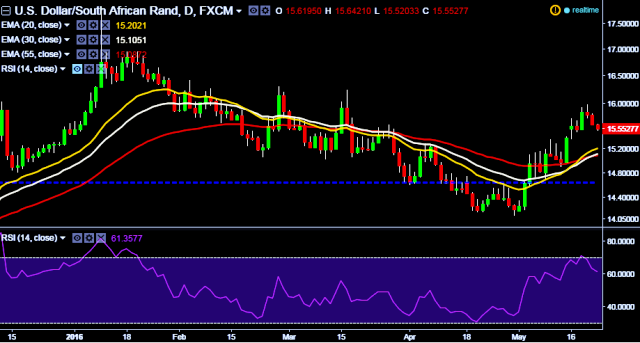 We prefer to take long position in USD/ZAR around 15.52, stop loss 15.37 and target 15.98/ 16.15 marks.