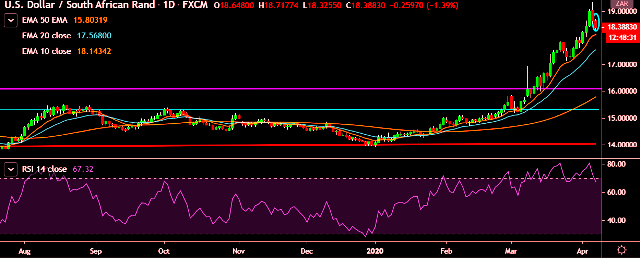 We prefer to take short position on USD/ZAR around 18.40, stop loss at 18.72 and target of 18.10/17.90.