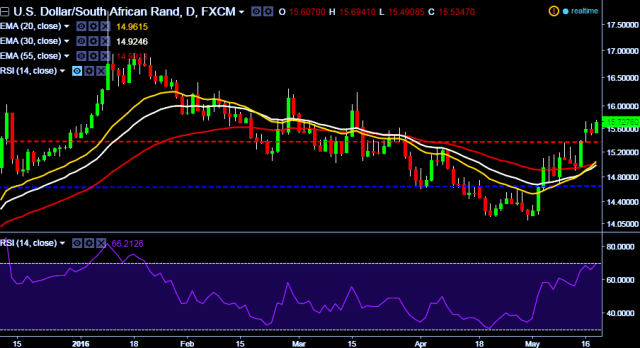 We prefer to take long position in USD/ZAR only above 15.74, stop loss 15.37 and target 16.13 levels.