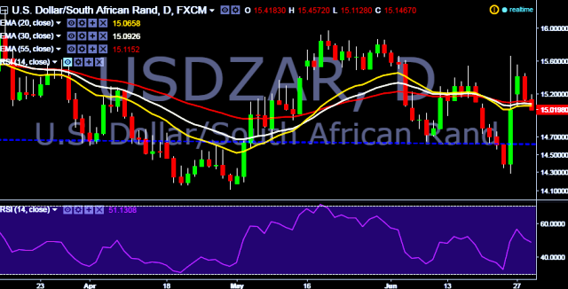 We prefer to take short position on USD/ZAR only below 14.96 with stop loss at 15.28 and target 14.71/ 14.43 marks.