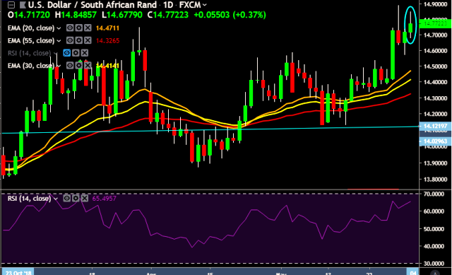 We prefer to take long position on USD/ZAR around 14.74, stop loss at 14.50 and target of 14.94/15.26.