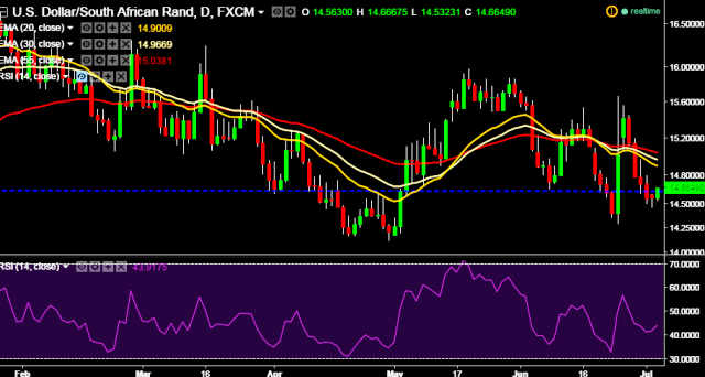 We prefer to take long position on USD/ZAR only above 14.75 with stop loss at 14.45 and target 14.96/ 15.28 marks.