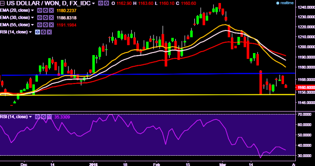 We prefer to take short position in USD/KRW around 1162, stop loss 1173 and target 1153/1142 levels.