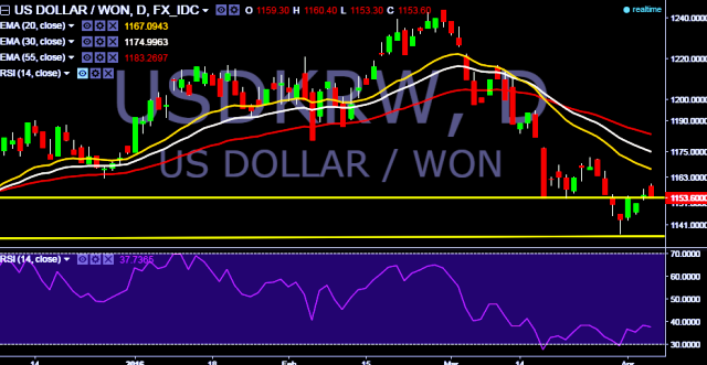 We prefer to take short position in USD/KRW only below 1153, stop loss 1162 and target 1142 levels.