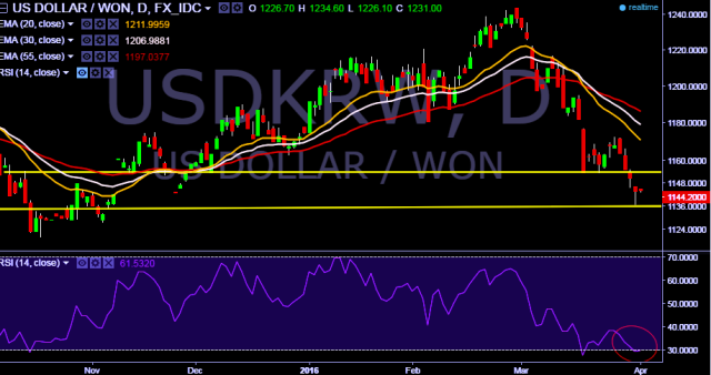 We prefer to take short position in USD/KRW around 1145, stop loss 1155 and target 1129/1122 levels.