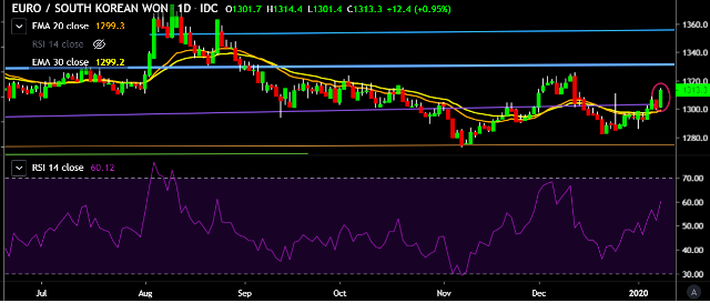 We prefer to take long position on EUR/KRW around 1,308, stop loss at 1,297 and target of 1,323/1,347.