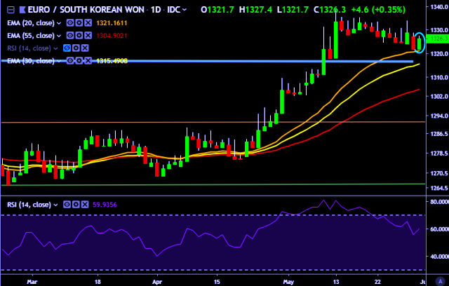 We prefer to take long position on EUR/KRW only above 1,333, stop loss 1,320 and target of 1,358.