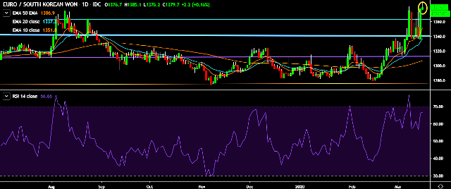 We prefer to take long position on EUR/KRW around 1,375, stop loss at 1,350 and target of 1,390/1,408/1,428.