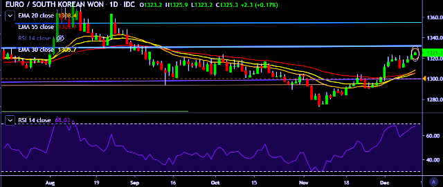 We prefer to take long position on EUR/KRW around 1,322, stop loss at 1,317 and target of 1,347.