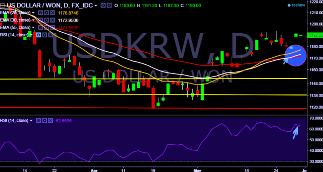 We prefer to take long position in USD/KRW only above 1194, stop loss 1177 and target 1209 marks.