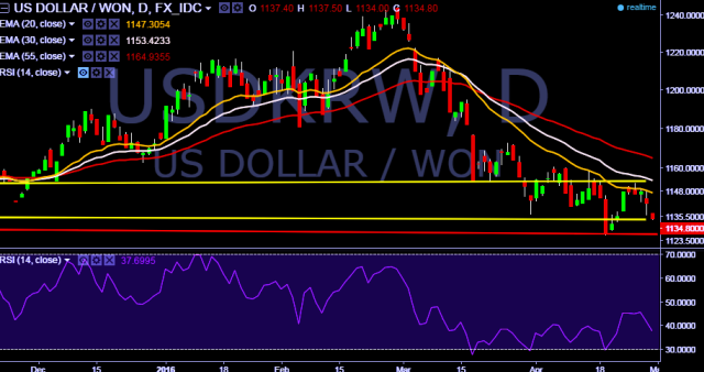We prefer to take short position in USD/KRW only below 1132, stop loss 1142 and target 1121/1115 levels.
