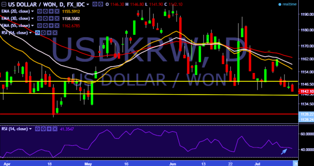 We prefer to take short position in USD/KRW only below 1142, stop loss 1157 and target 1127 marks.