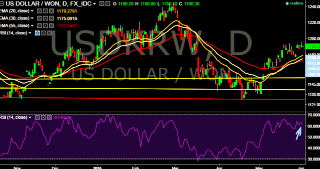 We prefer to take long position in USD/KRW only above 1194, stop loss 1177 and target 1209 marks.