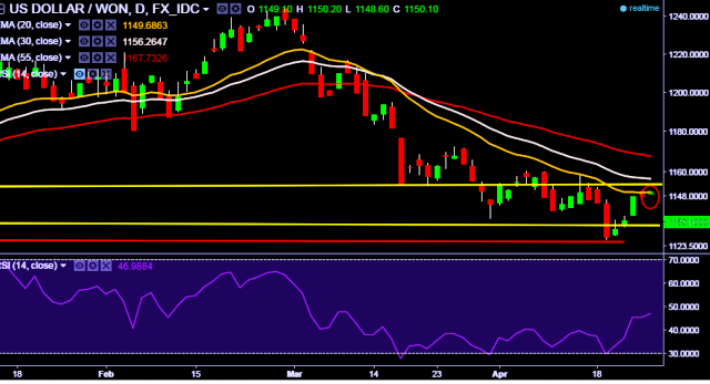 We prefer to take long position in USD/KRW only above 1153, stop loss 1142 and target 1168/1172 levels.