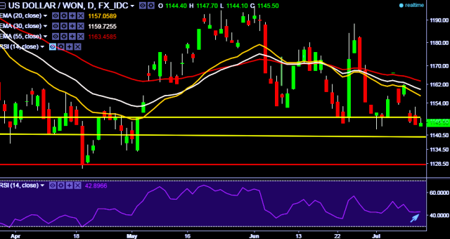 We prefer to take short position in USD/KRW only below 1142, stop loss 1157 and target 1127 marks.