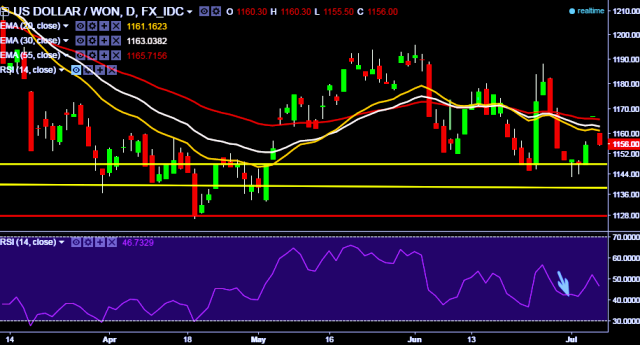 We prefer to take short position in USD/KRW around 1158, stop loss 1172 and target 1142/ 1127 respectively.