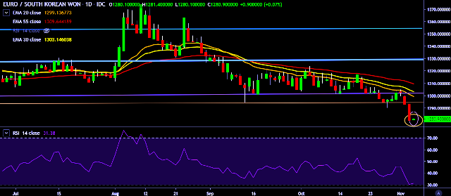 We prefer to take short position on EUR/KRW only below 1,280, stop loss at 1,294 and target of 1,244.