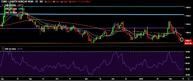 - EUR/KRW is currently trading around 1,280 mark.