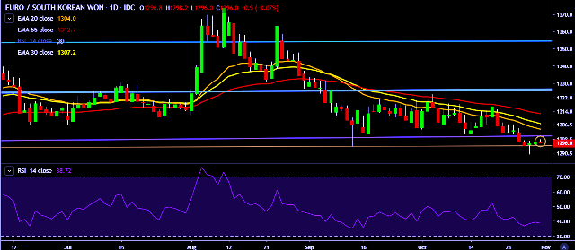 We prefer to take short position on EUR/KRW around 1,296, stop loss at 1,302 and target of 1,287/1,278.