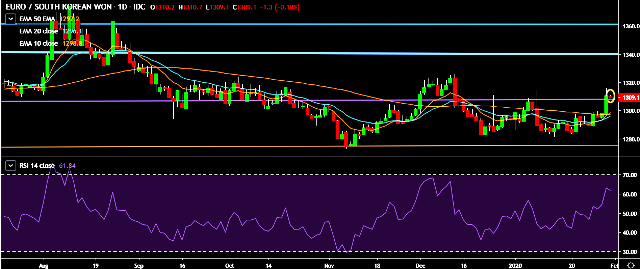 We prefer to take long position on EUR/KRW only above 1,310, stop loss at 1,295 and target of 1,323.