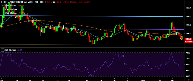 We prefer to take short position on EUR/KRW around 1,290, stop loss at 1,298 and target of 1,282/1,274.