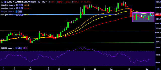 We prefer to take long position on EUR/KRW around 1,317, stop loss 1,308 and target of 1,340/1,358.
