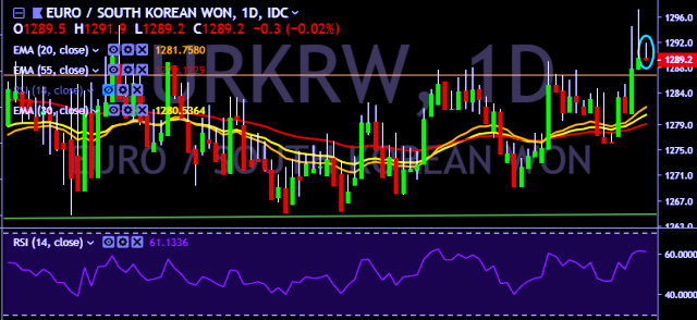 We prefer to take short position on EUR/KRW only below 1,287, stop loss 1,295 and target of 1,277.