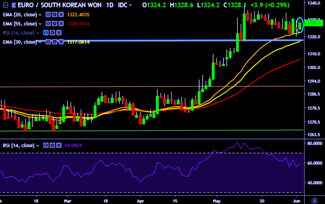 We prefer to take long position on EUR/KRW only above 1,330, stop loss 1,320 and target of 1,358.