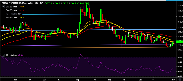 - EUR/KRW is currently trading around 1,303 mark.