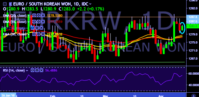 We prefer to take long position on EUR/KRW around 1,280, stop loss 1,270 and target of 1,294/1,307.