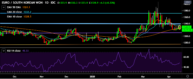 We prefer to take long position on EUR/KRW around 1,328, stop loss at 1,322 and target of 1,337/1,358.