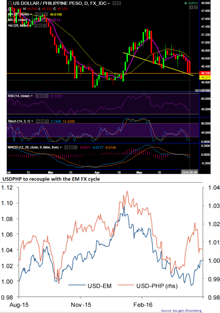 Under this scenario, USDPHP should be pulled up by the broader EM FX trend. The de-coupling between USDPHP and EM FX over the past weeks, when the peso moved from 47.60 to 46.50 while USD-EM was moving higher, is highly unusual compared to historical patterns, and with domestic noise in the rear view mirror a re-coupling should occur.